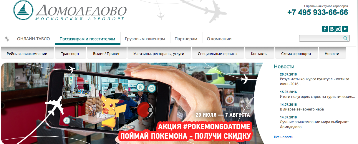 From 20th July to 7th August, thanks to #PokemonGOatDME initaitive, a number of shops and restaurants at Domodedovo International Airport are going to offer discounts to those passengers that show staff snapshots of the Pokemons they have captured in their premises.