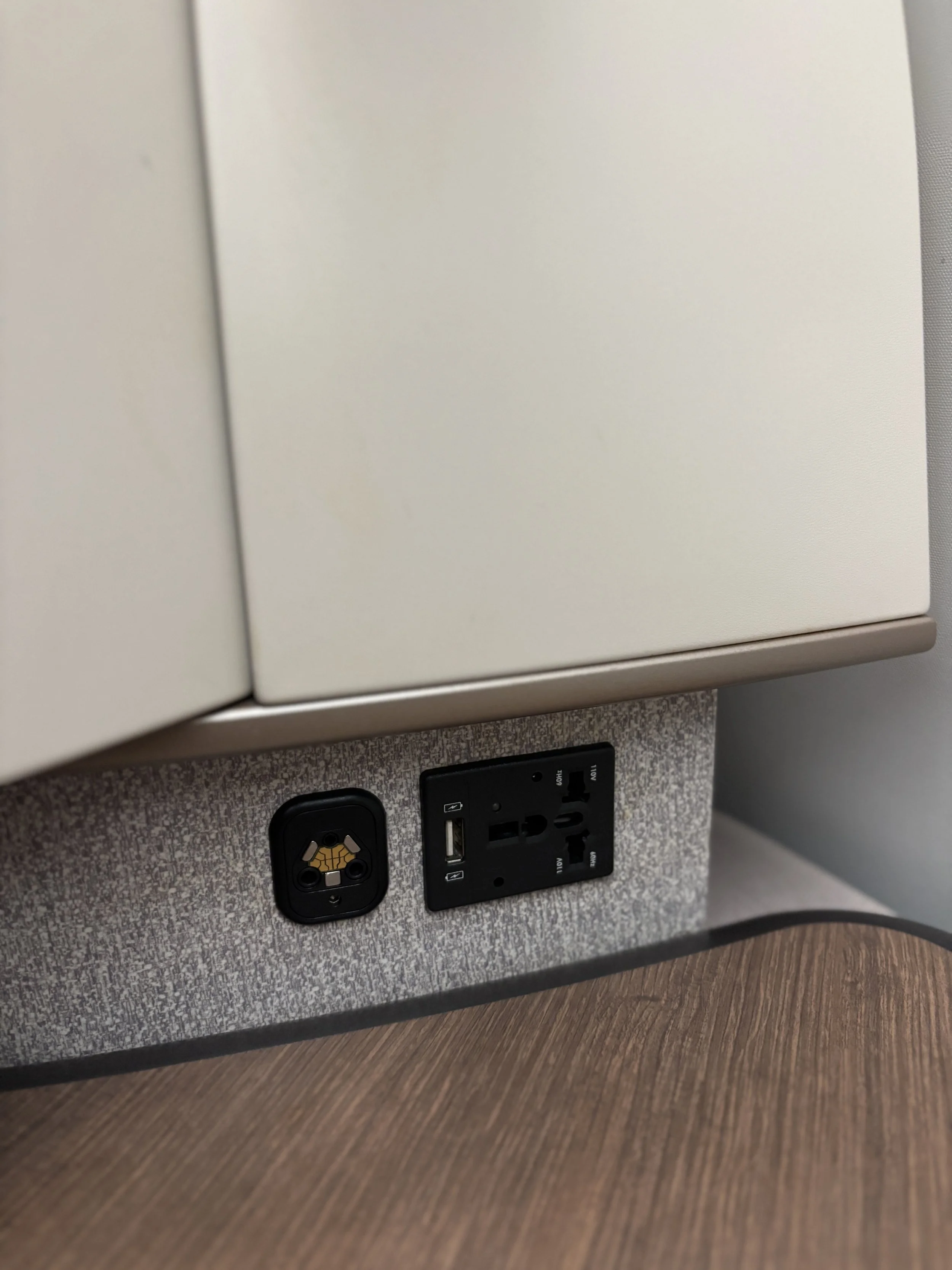 More details: there are in-seat power outlets, both USB and universal charger type. And I also find quite interesting this shallow drawer on the left (all additional storage space for small items like phones, documents, etc. is very welcome, my only concern in this regard is that it looks like an easy place in which to forget your stuff!).