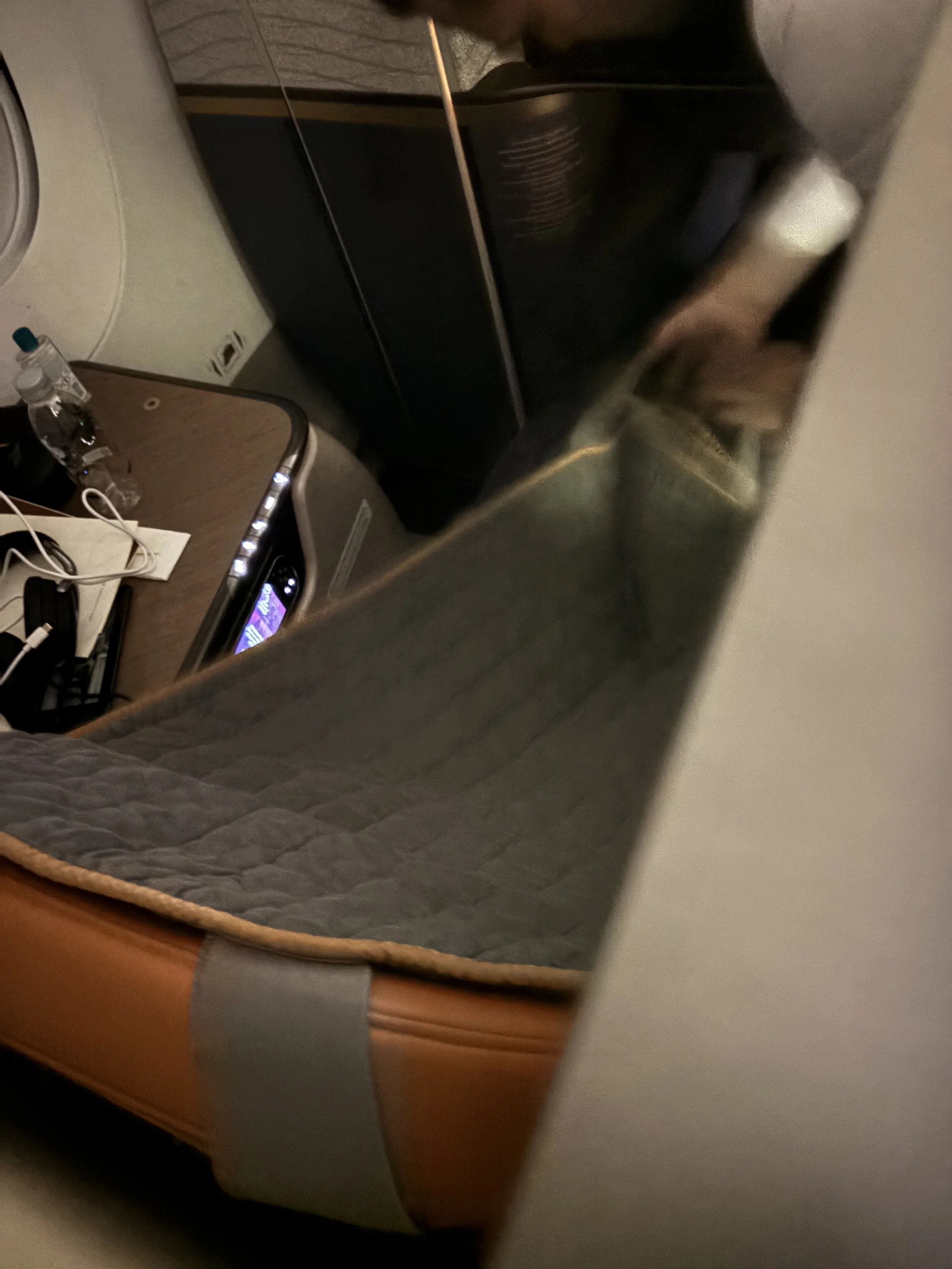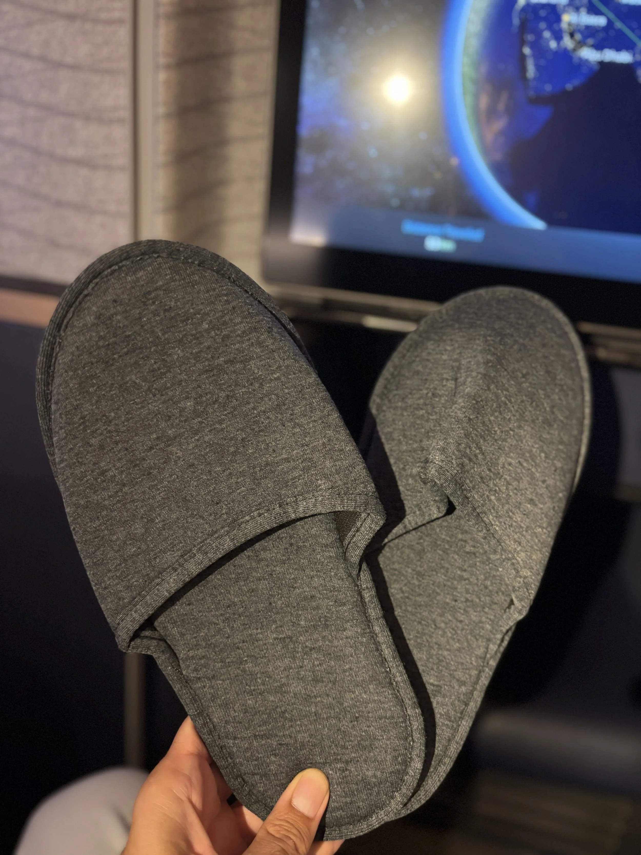 Below you can also see the footwell at the front, which becomes part of the “bed” when you activate the lie-flat seat setting. As you can see, you get also a blanket (and a pillow, not in the pic) and a set of slippers to make yourself comfy.