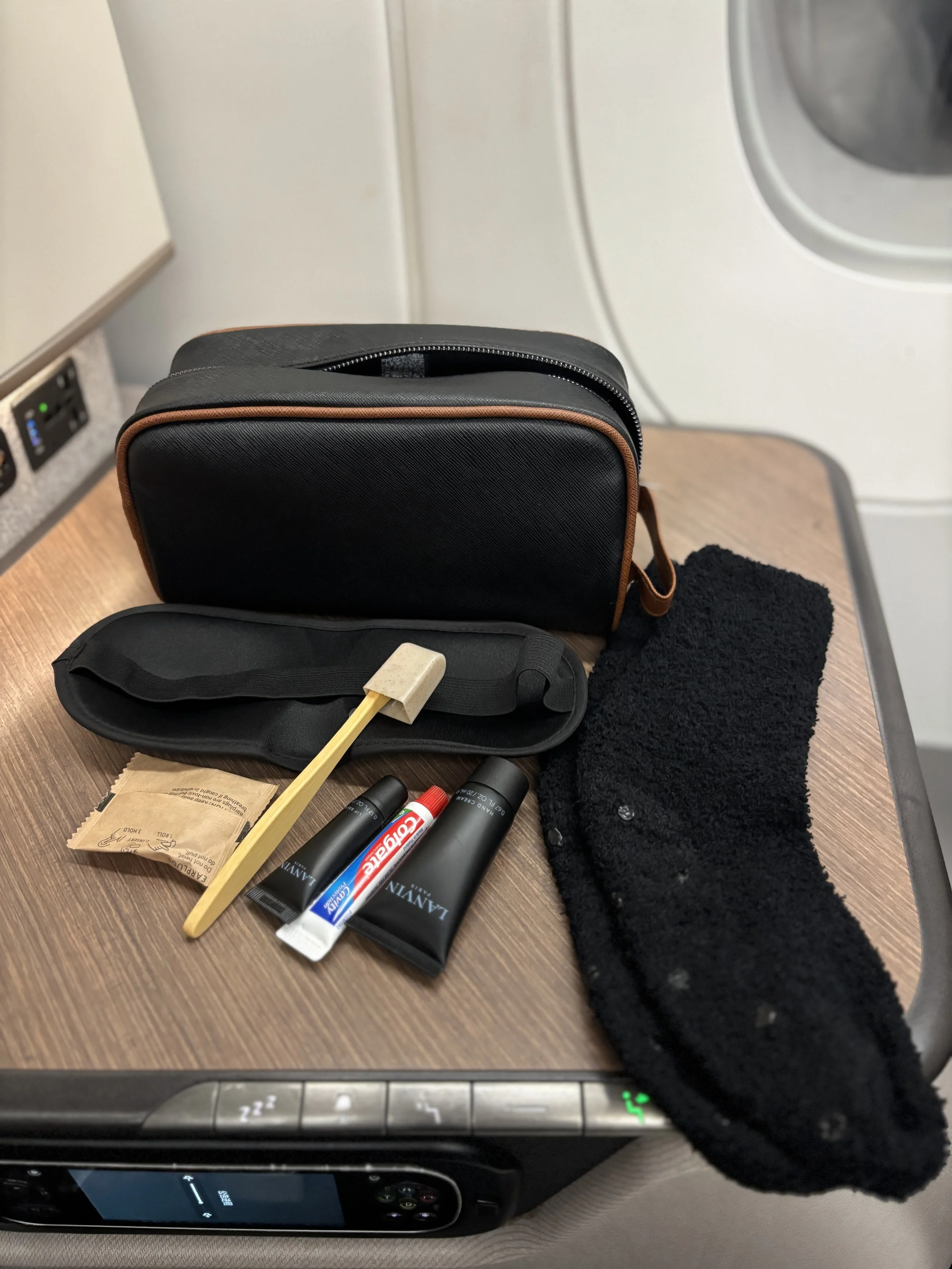 And next, let’s see the amenity kit (interestingly it was different on each of the long-haul flights in this itinerary, you will need to check my B777-300ER review to check the other one!). This one consisted in a very elegant, compact amenity bag the contents of which you can see here: eye-mask, ear-plus, dental kit, hand cream and a very comfy pair of socks (I liked the fact that these fitted me well, I have large feet and airplane socks are usually too small for me!).