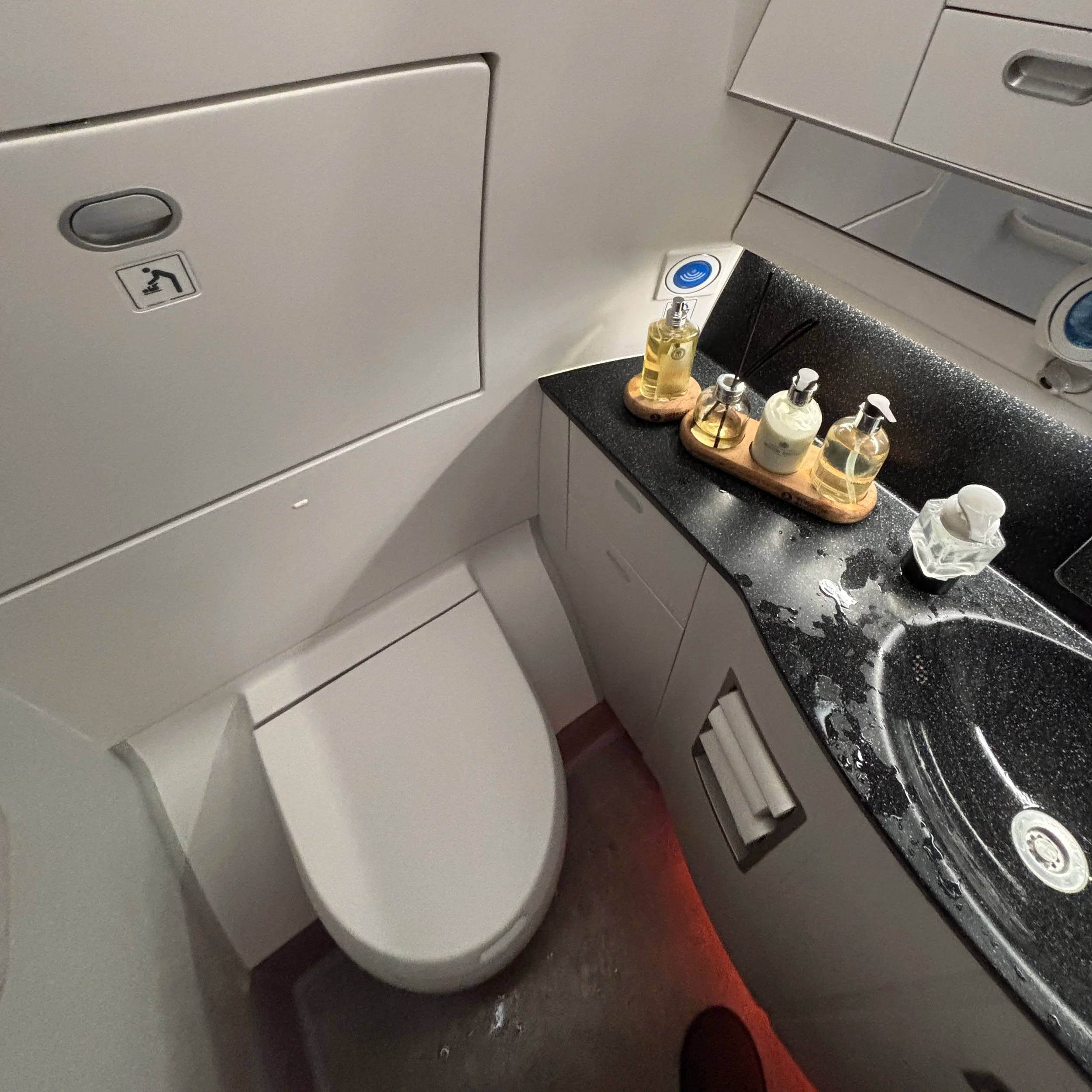 Also, for completness of this flight review, I add also a picture of the business class restroom at the front of the cabin, which has nothing special other than the fact that there are a few more toiletries than in the regular economy class restroom and, of course, fewer people actually using it, so no queues or the like.